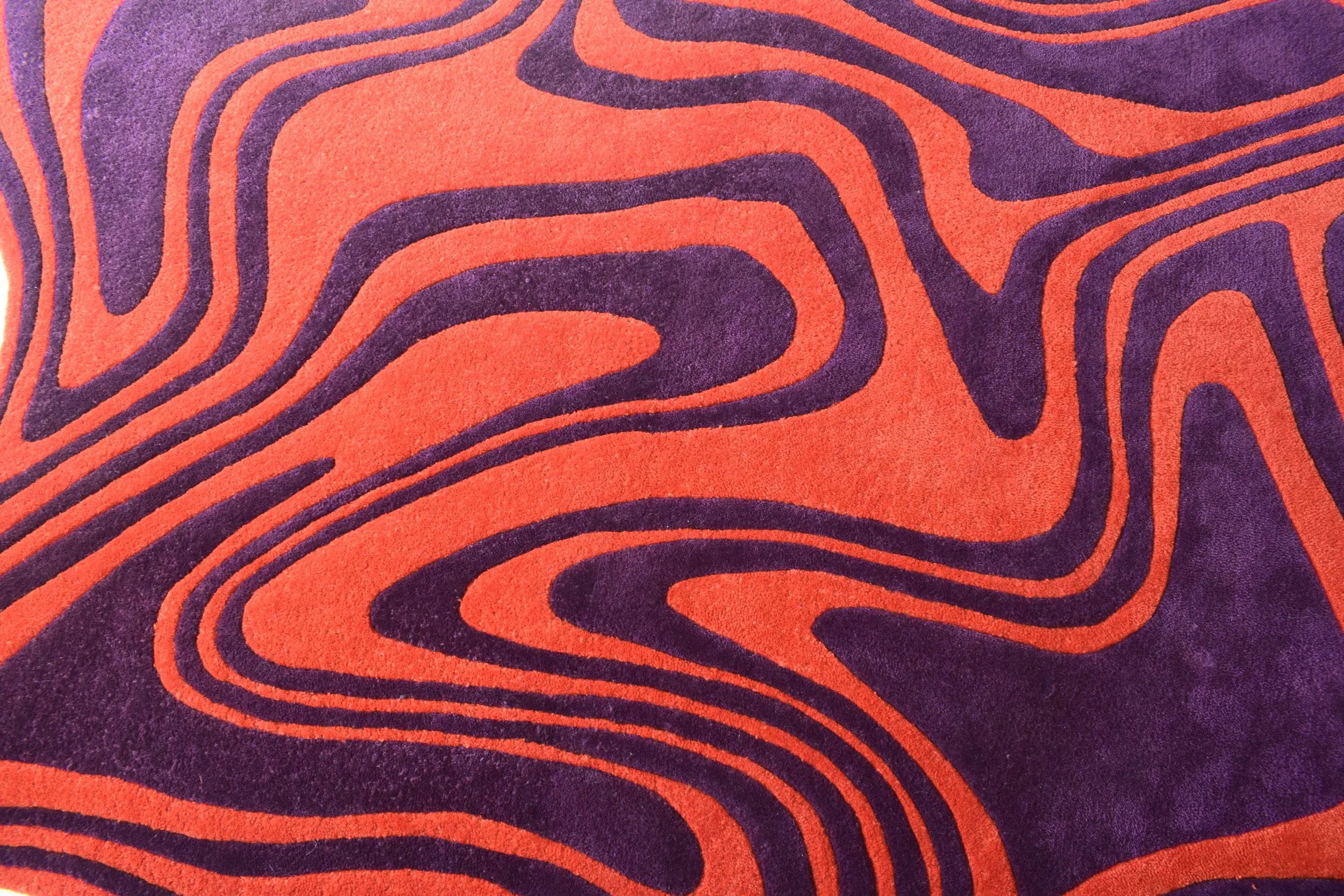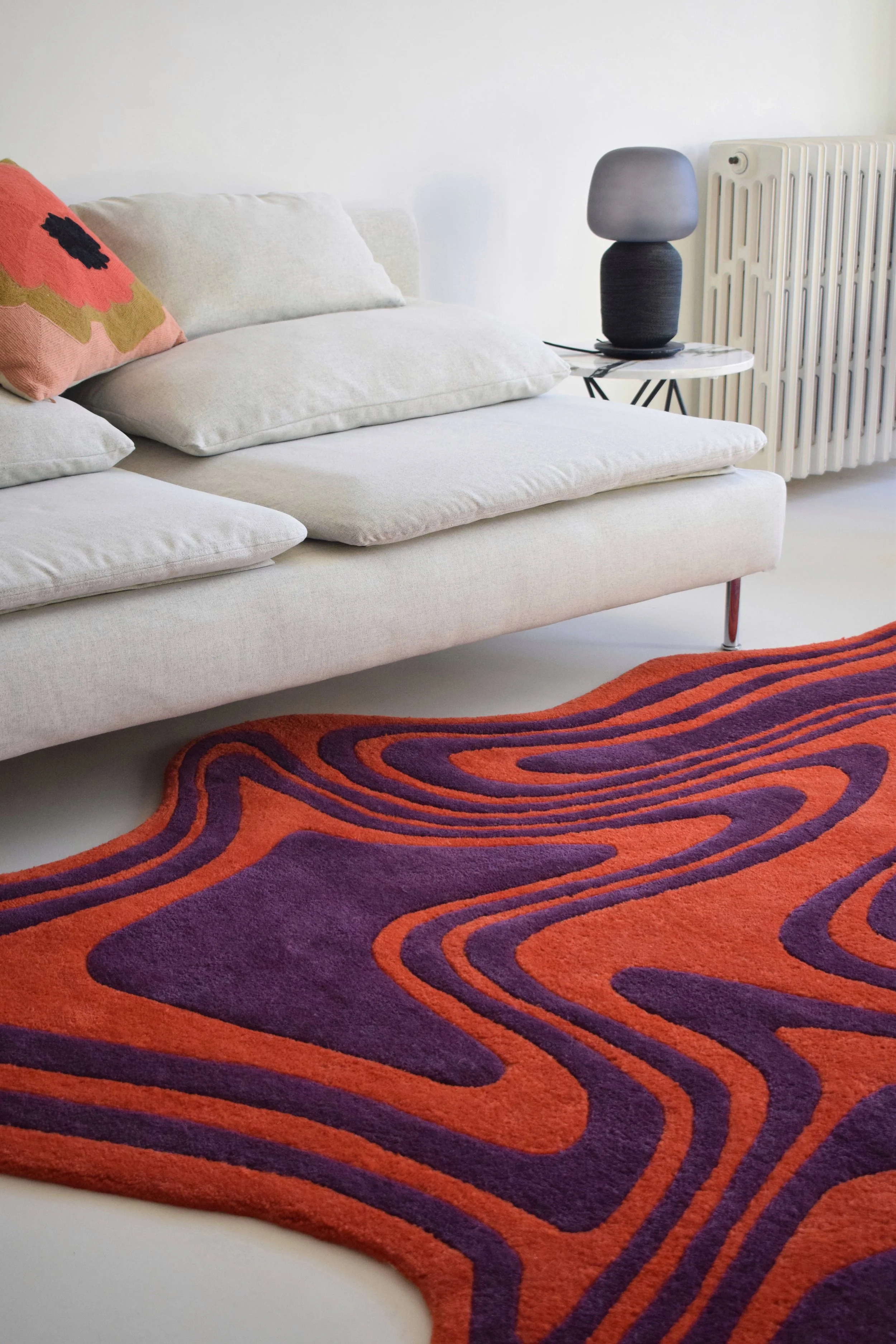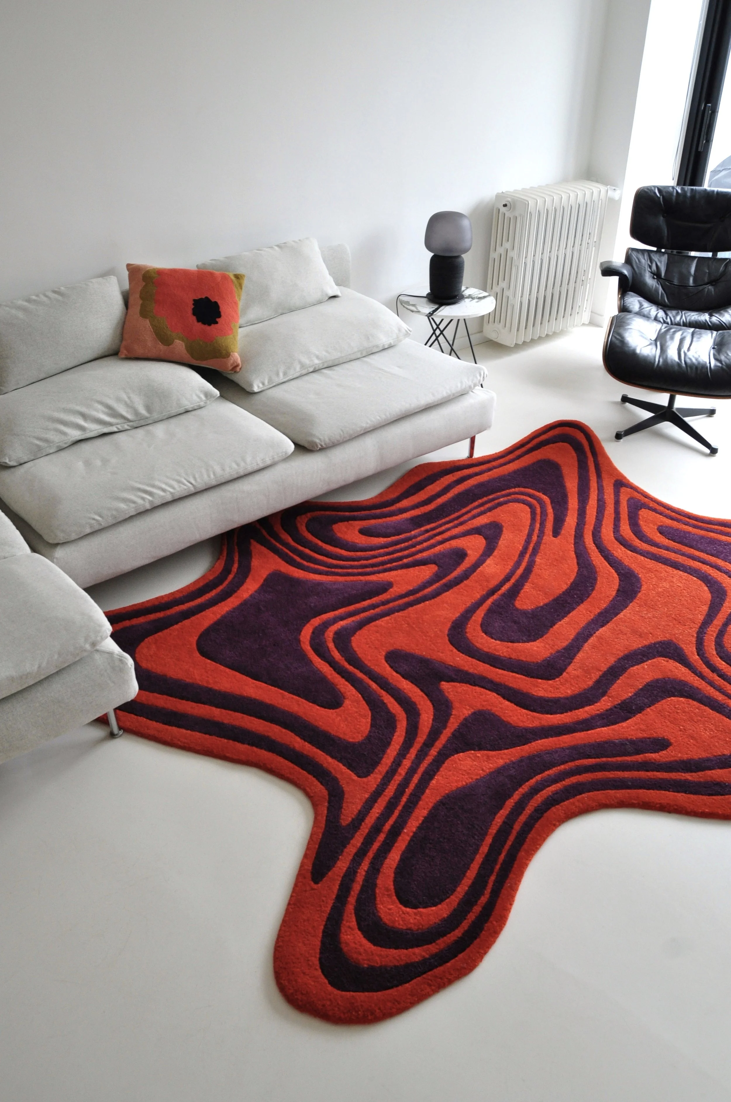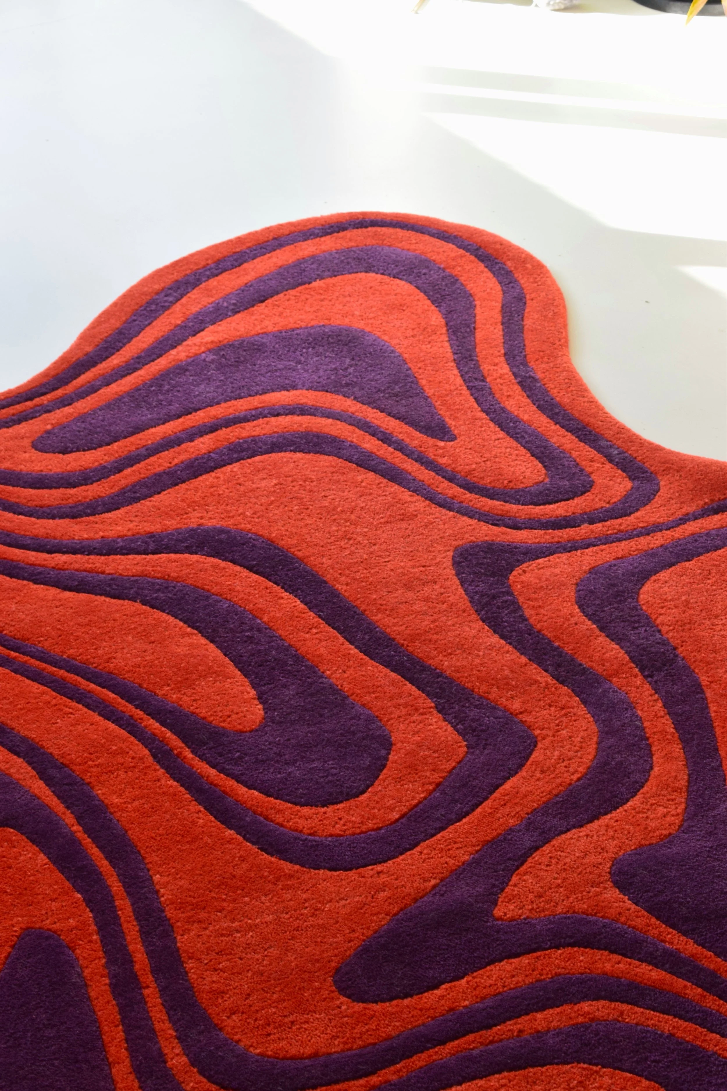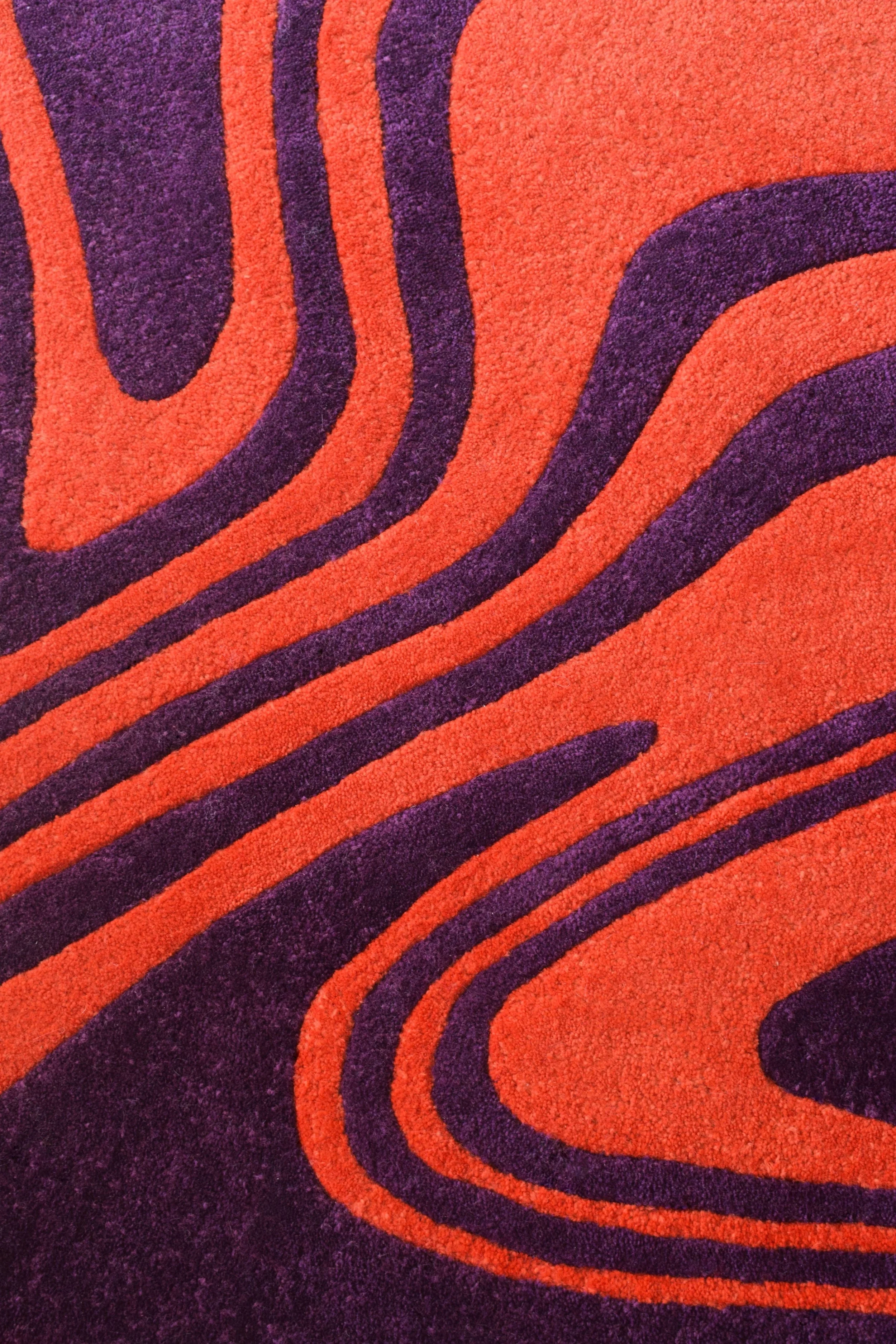 Le tapis Flux est tufté à la main, il se distingue par une forme organique et libre, rompant volontairement avec les contours rectilignes traditionnels. Sa surface vibrante combine des teintes oranges et violettes profondes, organisées en motifs fluides qui rappellent des courbes topographiques ou des ondes marines. Réalisé en pure laine, il est pensé comme une pièce visuelle à part entière, ce tapis vient structurer le sol tout en apportant une dimension expressive au lieu.